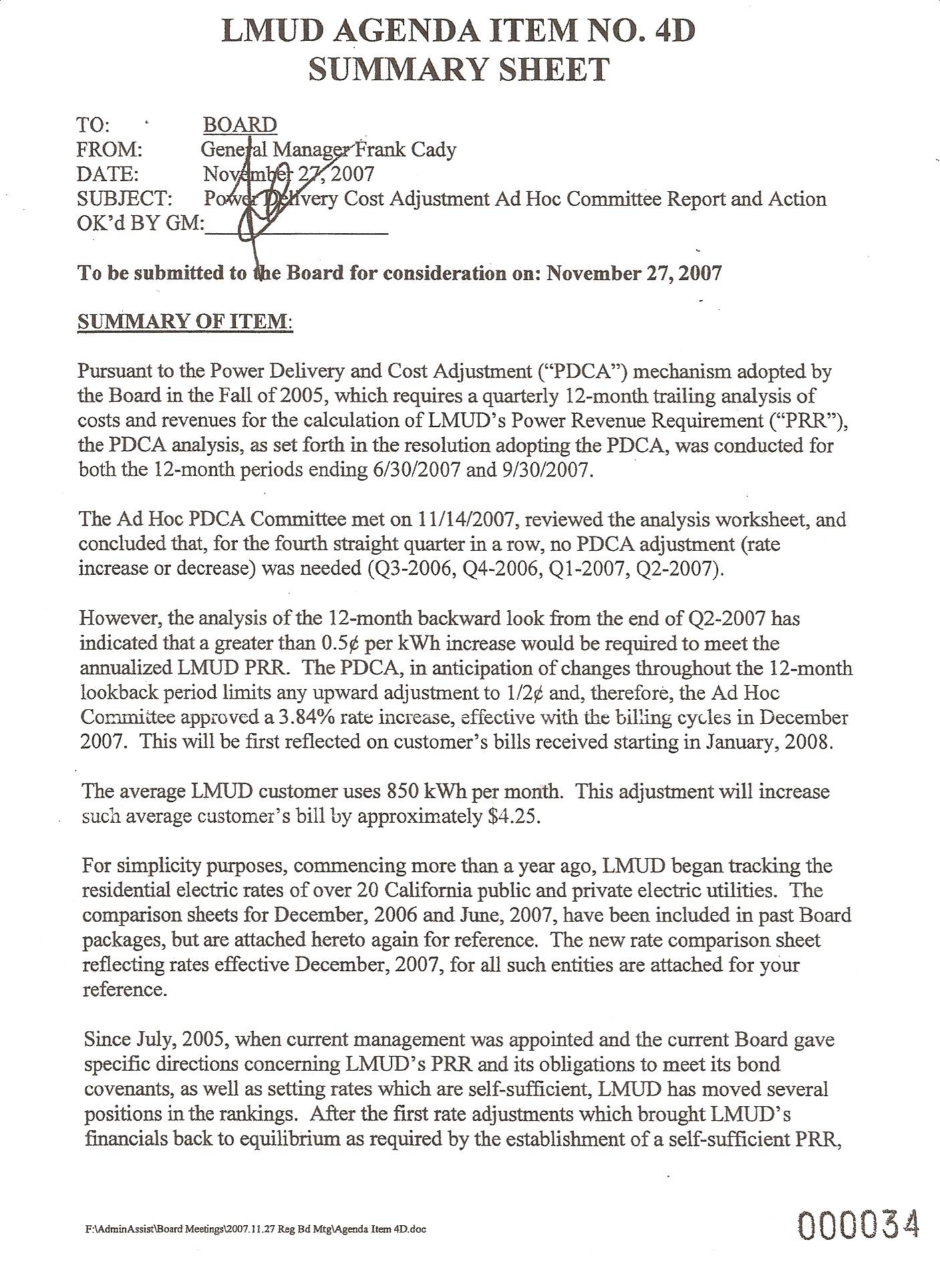 LMUD attorney Jones hid the last rate $ .05 increase in the November 27, 2007 Agenda