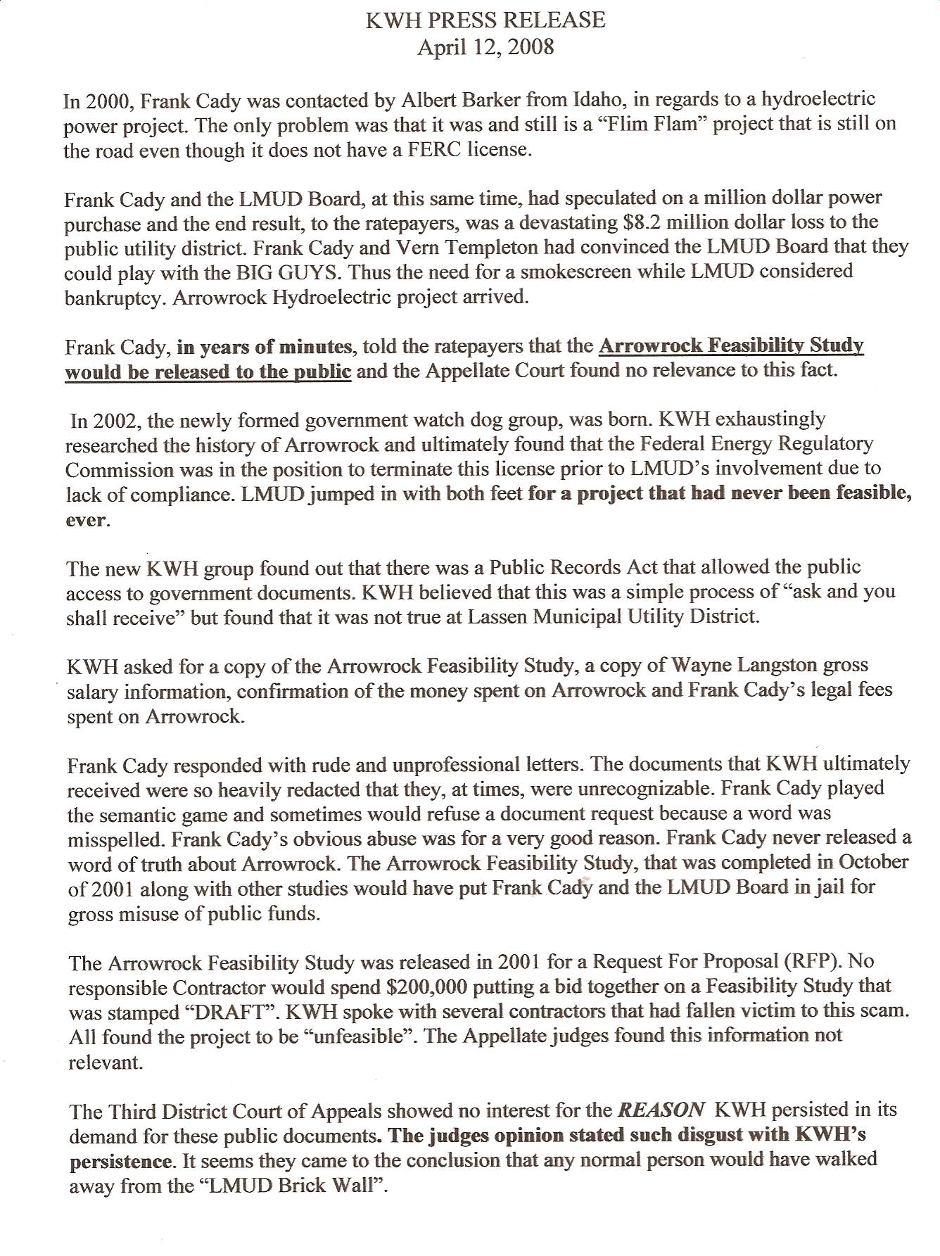 Kan We Help has been fighting the LMUD PDCA policy since its inception in 2005. The PDCA policy took public hearings out of the process and left it up to the General Manager's (Frank Cady) discretion to raise electric rates.