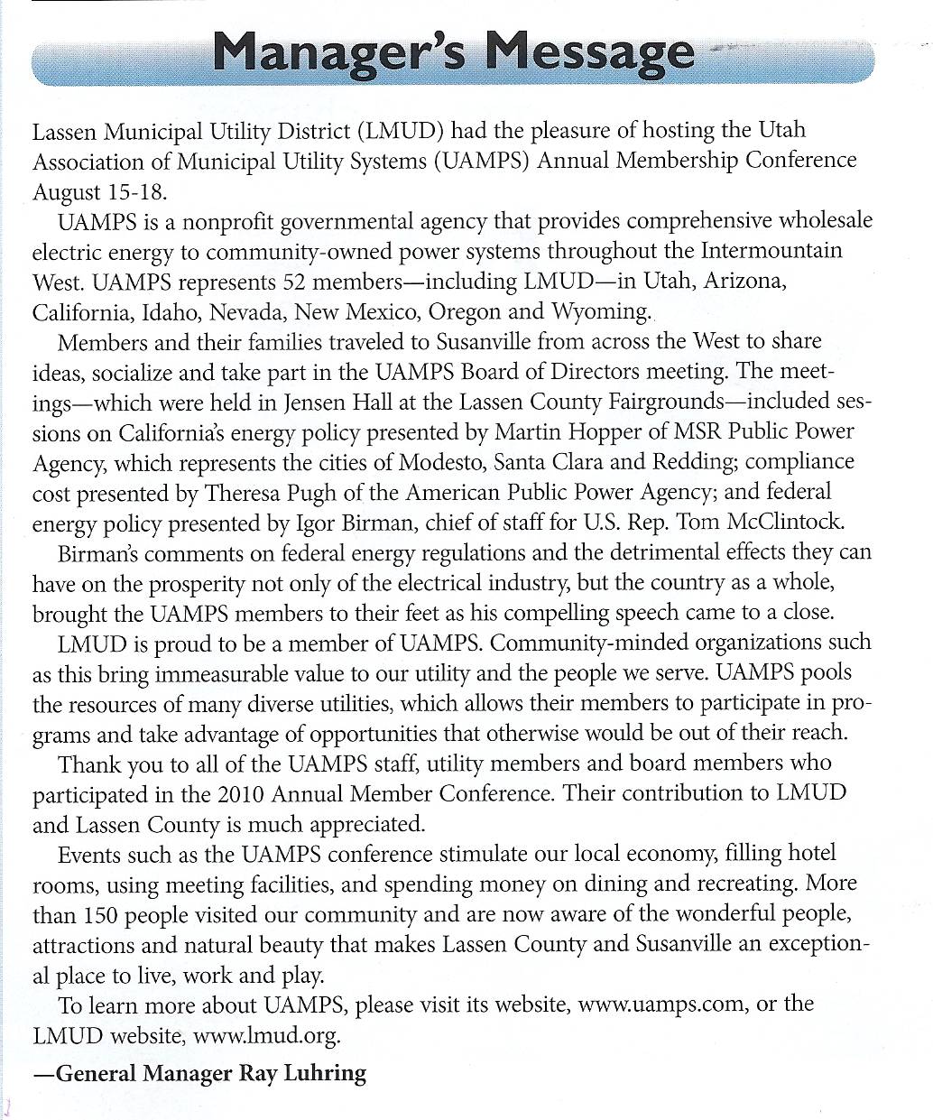 General Manager, Ray Luhring is on the UAMPS Board and Jay Dow was put on the Joint Powers Agreement