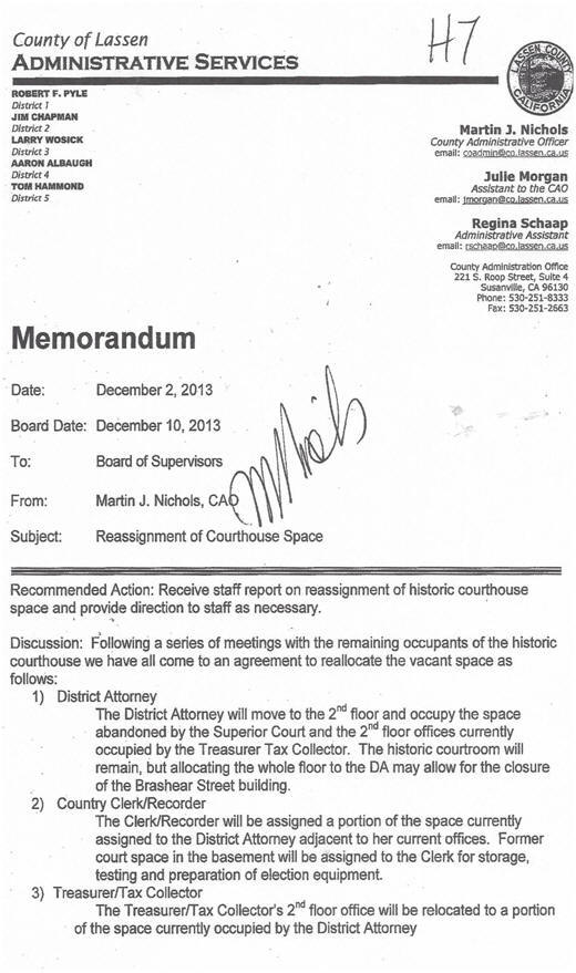 On December 10, 2013, CAO Martin Nichols presented a "Reassignment of Courthouse Space" to the Board of Supervisors.