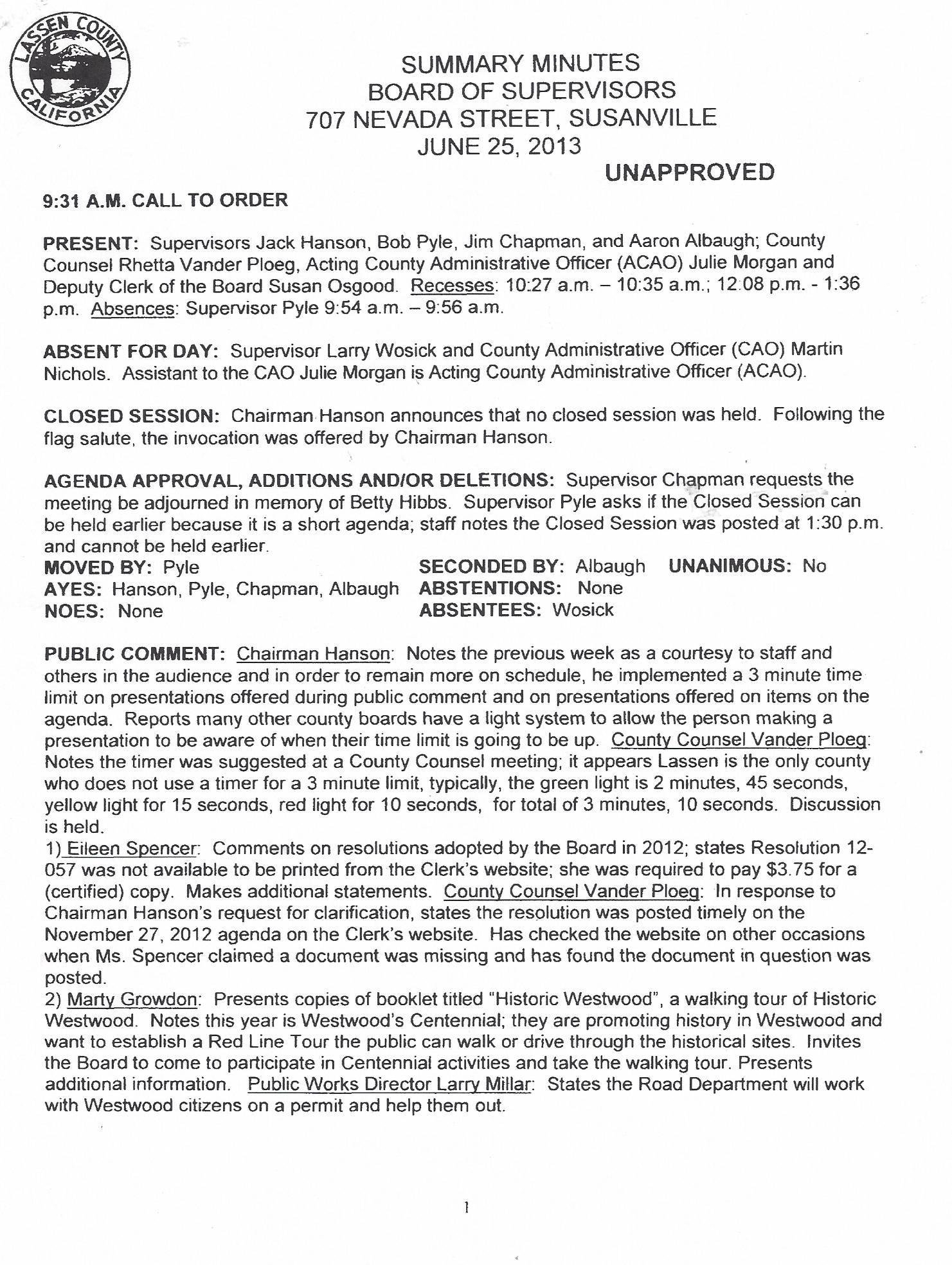 June 25, 2013 Minutes