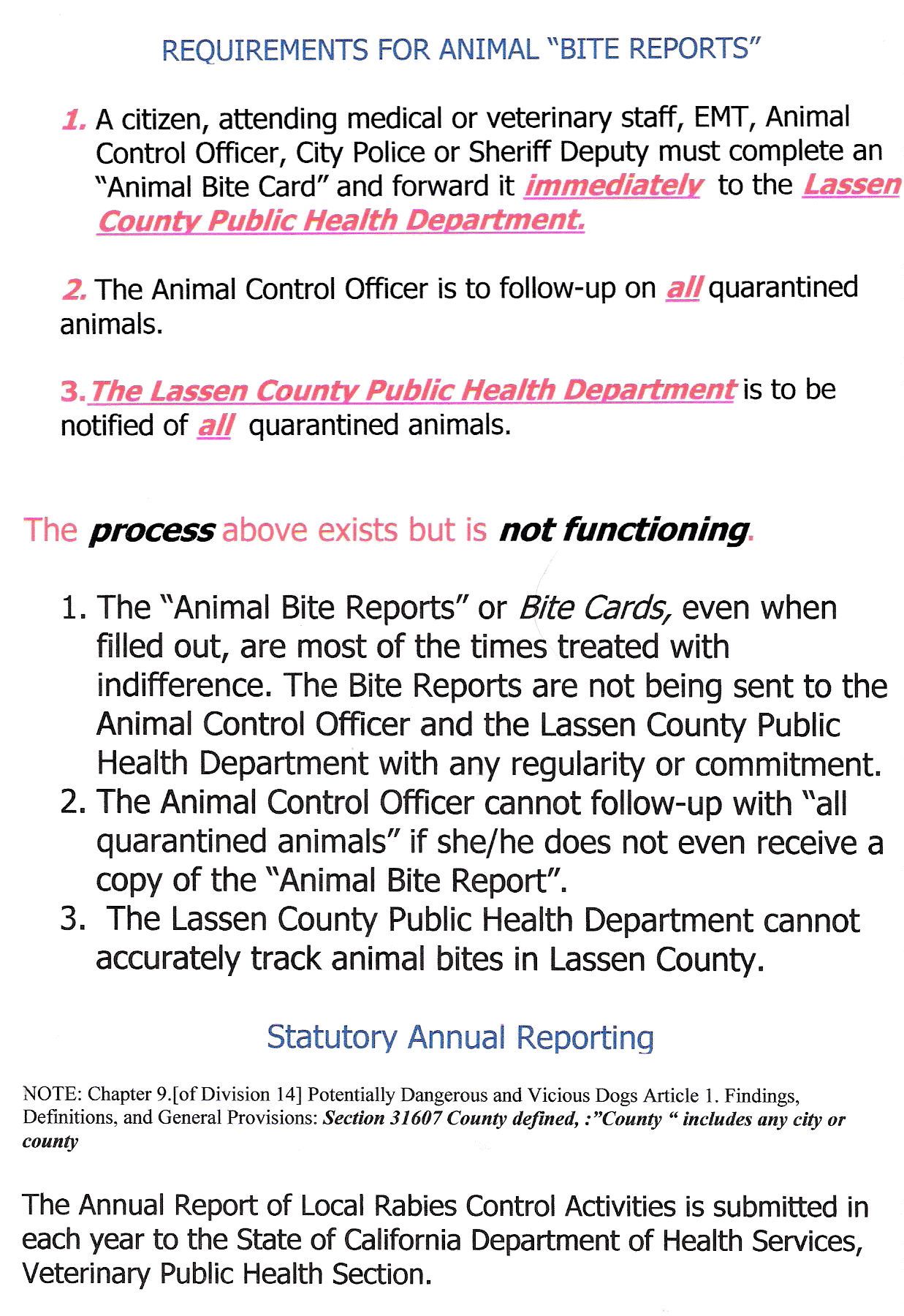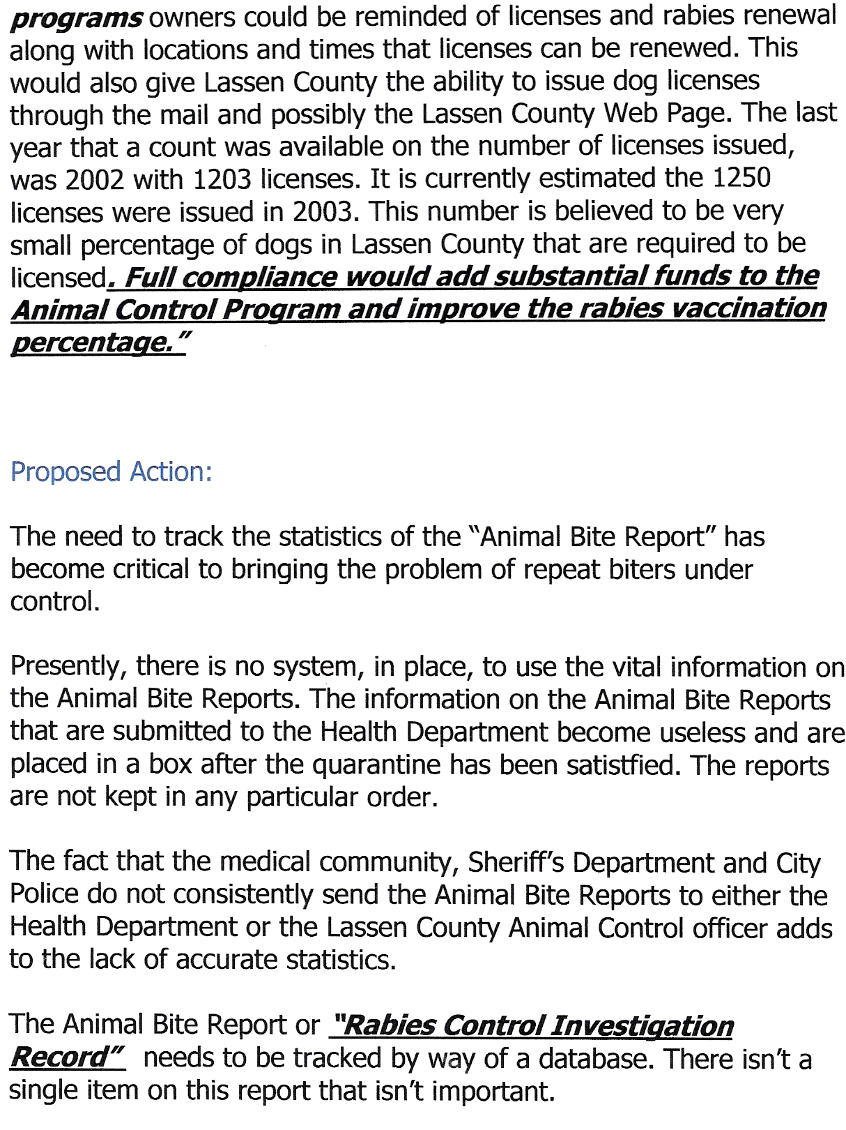 Lassen County "reported" only 33 total animal bites for 2004. (67% came from the City of Susanville and the City of Susanville eliminated their highly trained animal control officer).