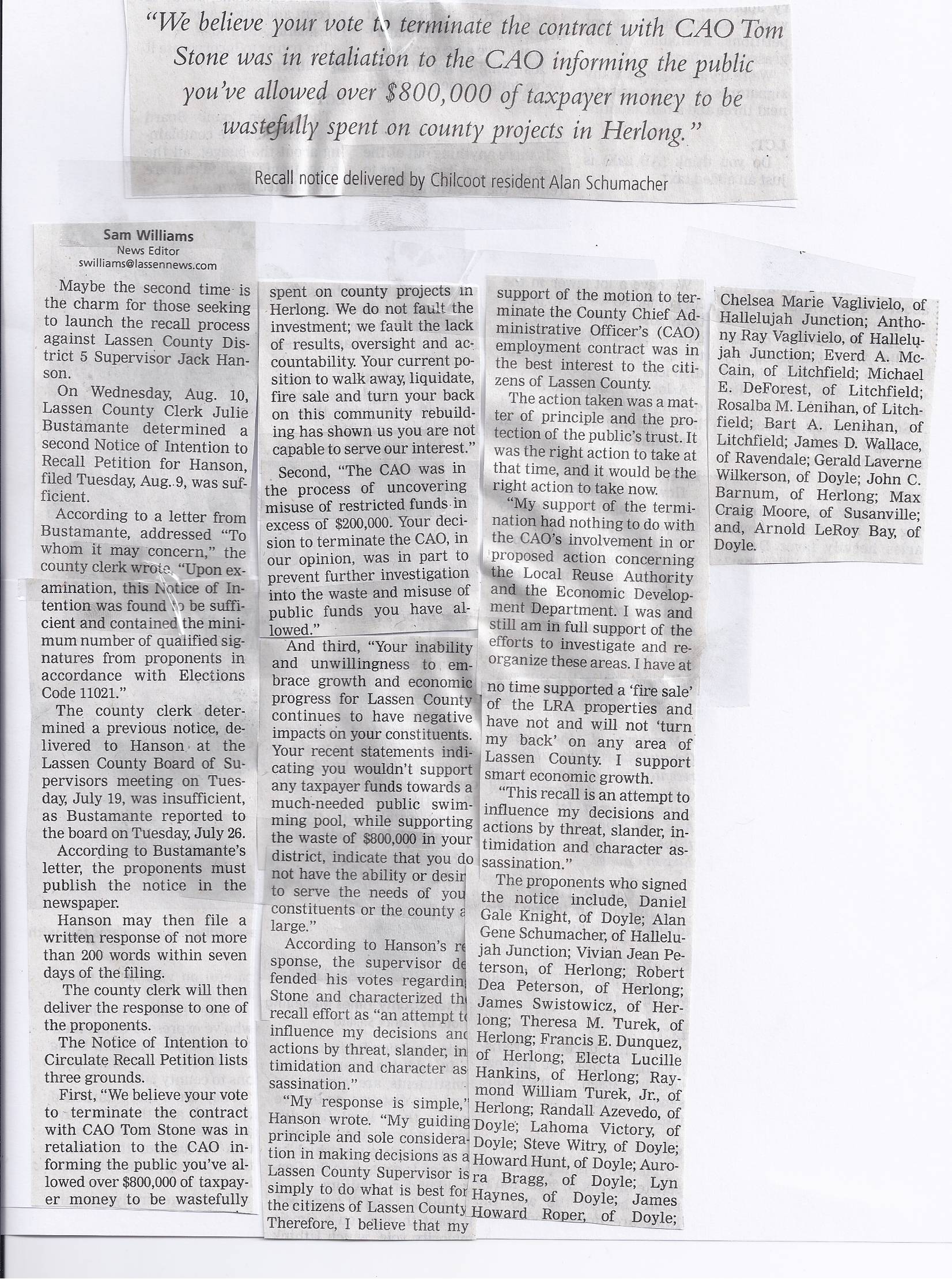 If the County Clerk does not try this, the Recall of Lassen County Supervisor Jack Hanson should proceed.