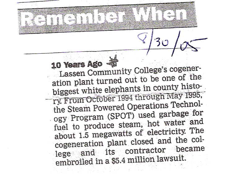The Lassen College Board members in 1983 built a co-generation plant for the purpose of lowering diesel and electrical costs, but found that it was more profitable to sell the energy to PG&E.
