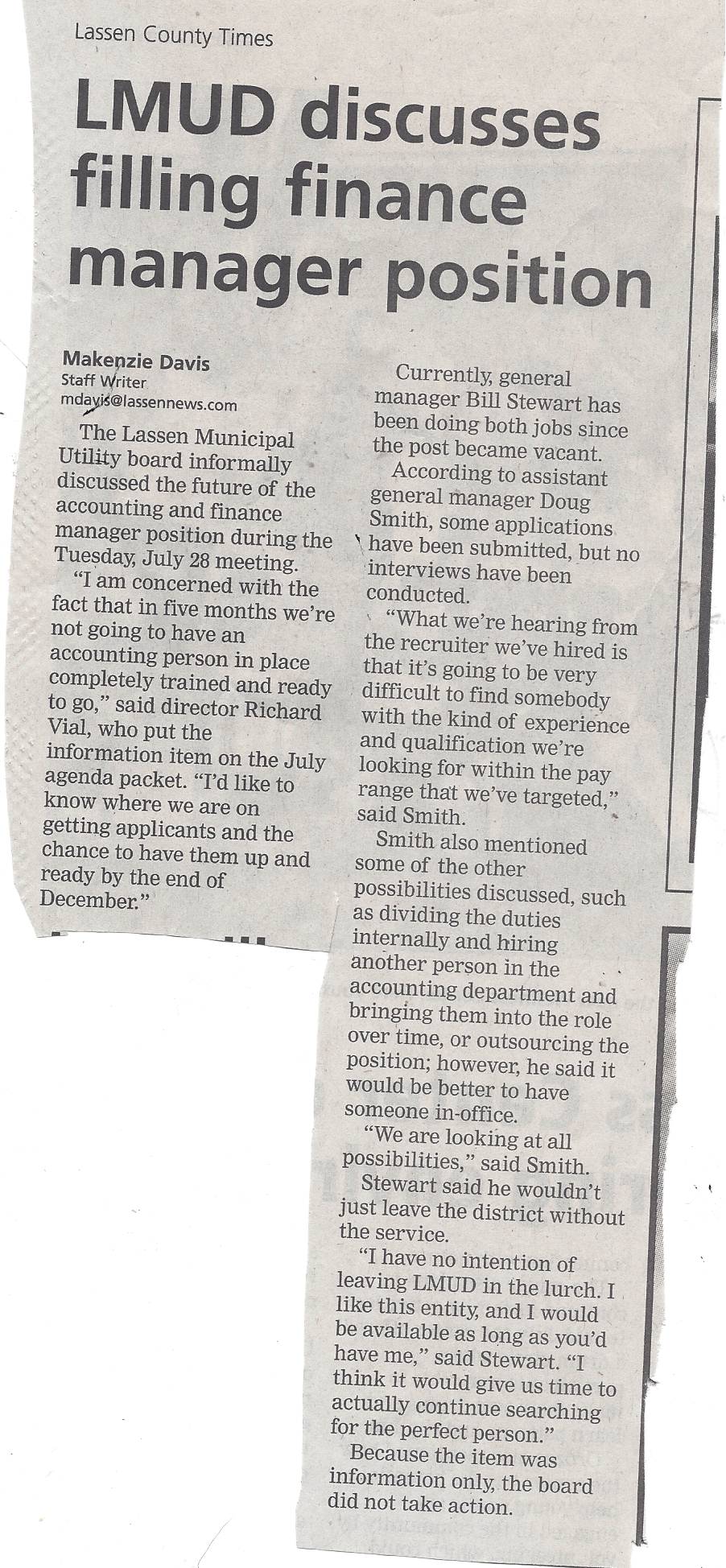 LMUD hired a Finance Manager years ago that is more than capable of managing LMUD finances.