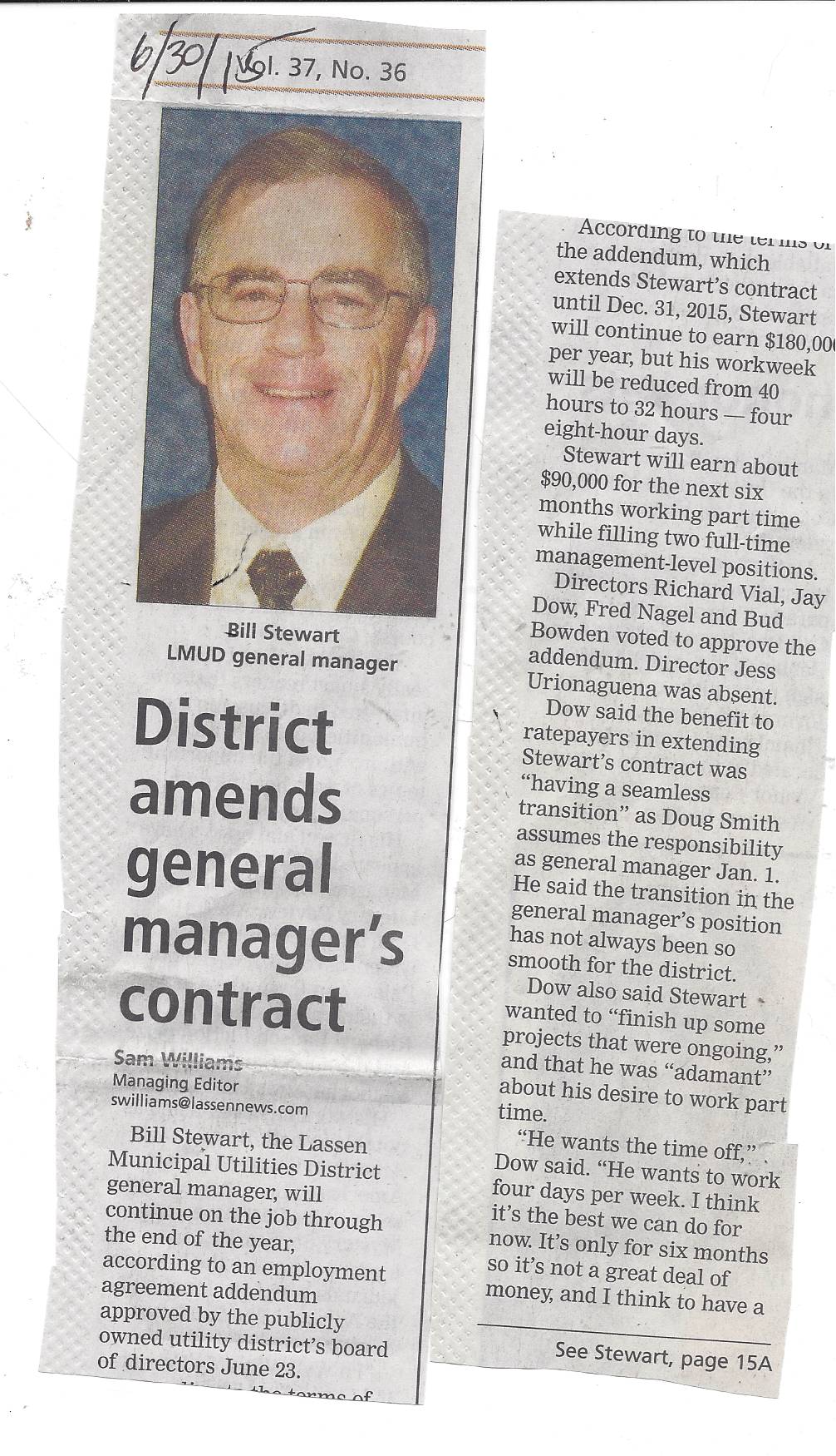Stewart has convinced the LMUD Board that because he is a CPA he deserves more money as the General Manager. Frank Cady (General Manager/Attorney) wanted the same but didn't get it.