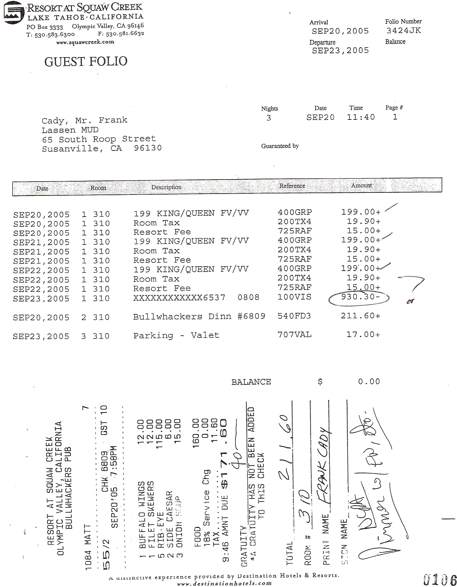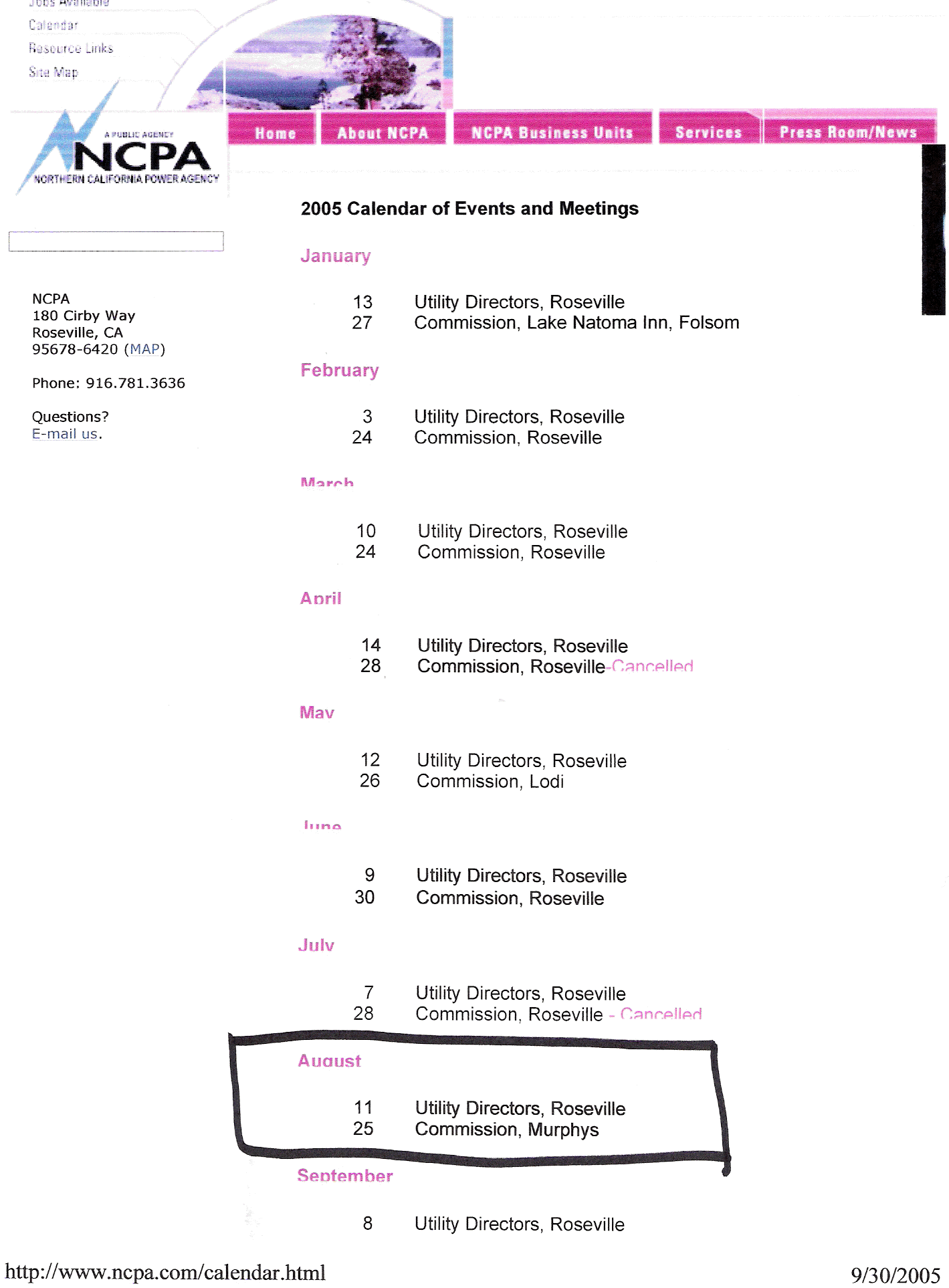 NCPA held their monthly meeting at Murphys, California on August 25, 2005. Cady did not identify that he attended this meeting on August 25,2005, yet he charged a room at the Murphy's Suites.