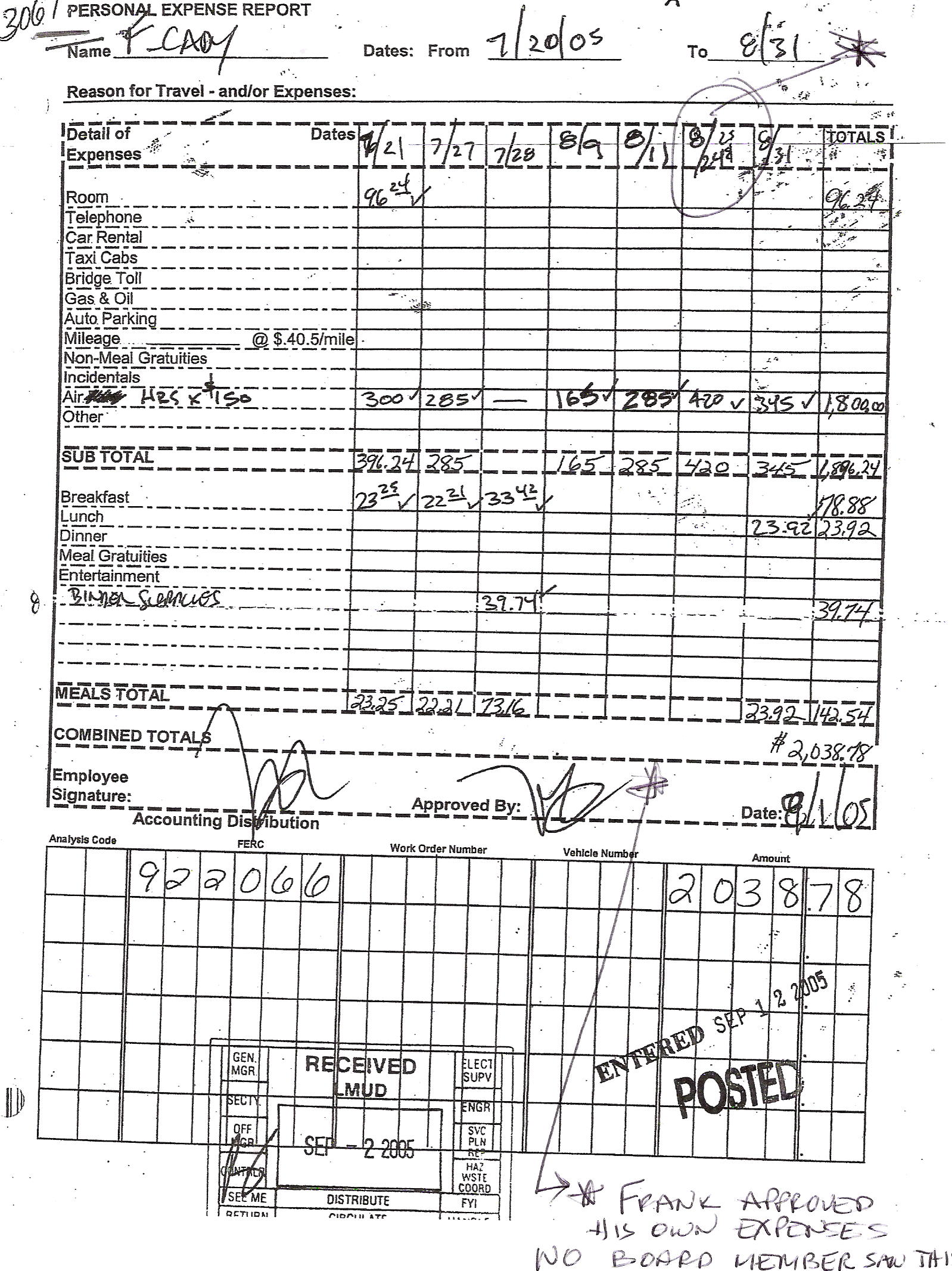 Frank Cady charges all of these expenses to "Employee Business Expenses" (G/L 922.066). Frank Cady approves his own expenses. No Board member saw or approved these expenses.