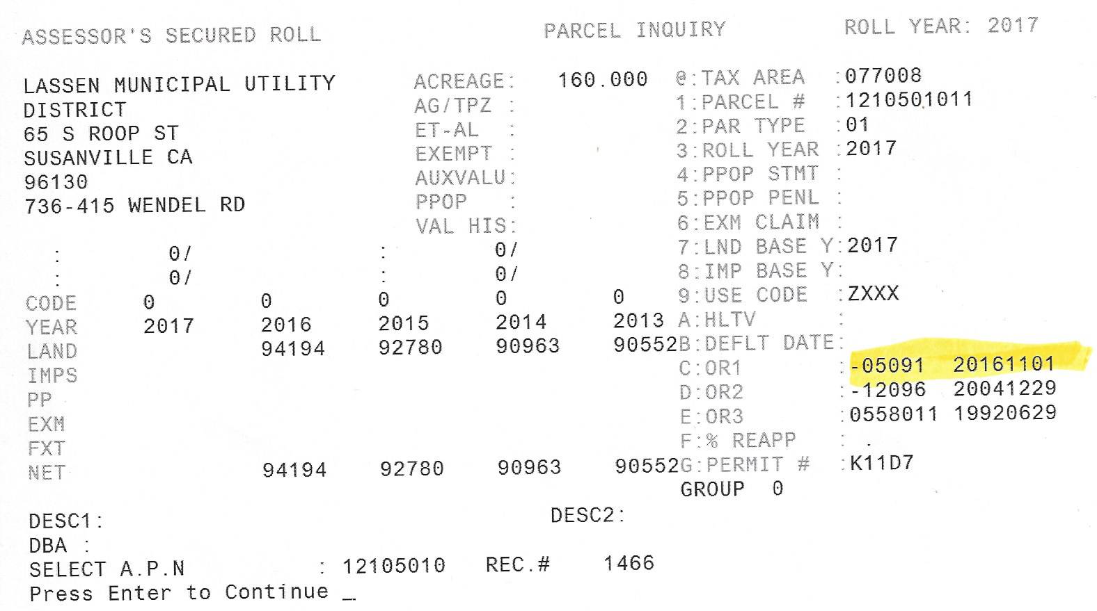 Lassen Municipal Utility District negotiations for the original Viewland Substation [ATT property :APN 109 -010-04] first appeared on an LMUD Agenda on August 28, 2007. LMUD negotiated with Mickey Villella from ATT. The property was contaminated and sat on BLM property. LMUD purchased this land, in September/2011, for $2500 with the intention of building a 230kv substation.