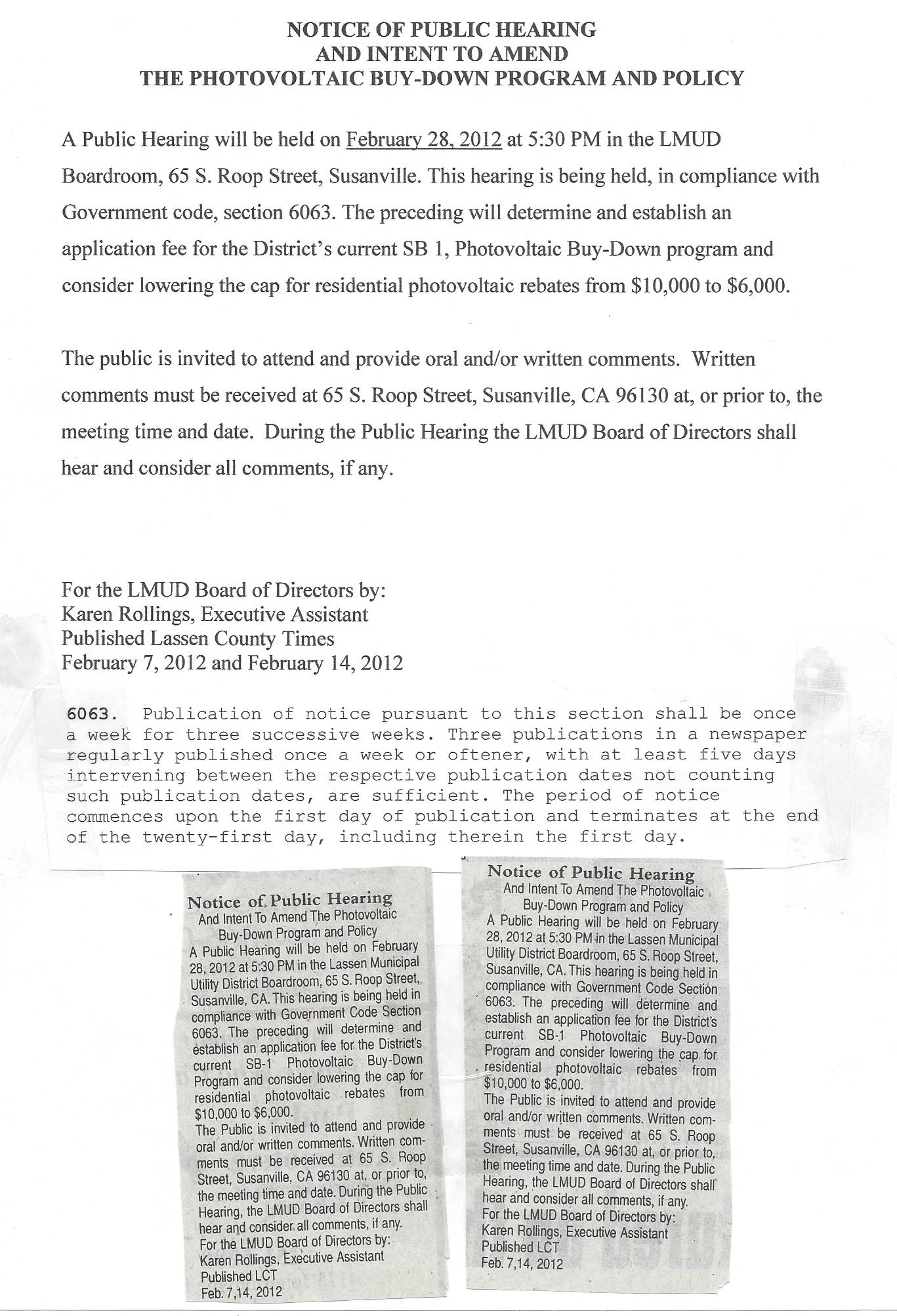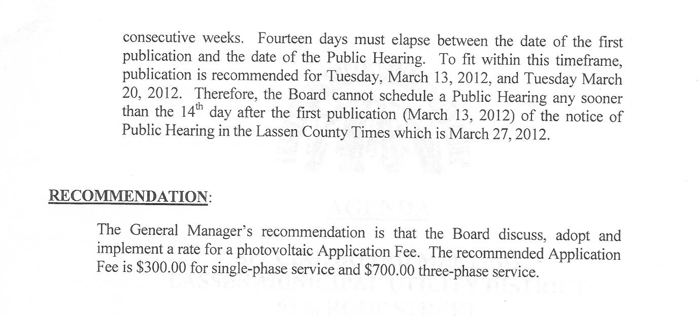The questionably legal ( This hearing had to be held within 40 days of the date of the General Manager's Report) Public Hearing on February 28, 2012 at the Regular LMUD meeting intends to further discourage anyone from considering solar panels.