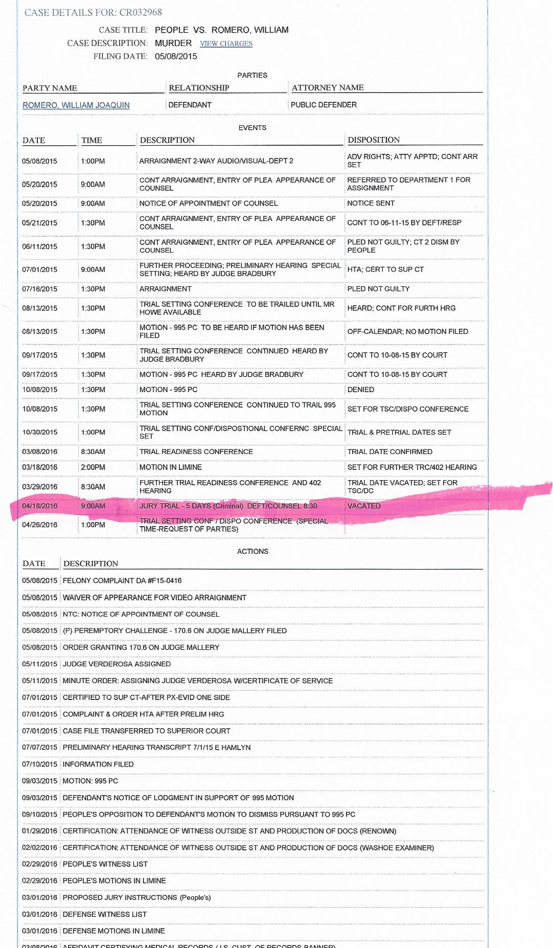 William Romero's bail is now set at $1.5 million. Romero's Public Defender Rhea Giannani was granted a Continuance (for entry of plea) until June 11, 2015 at 1:30 at the Riverside Hall of Justice in Susanville, CA