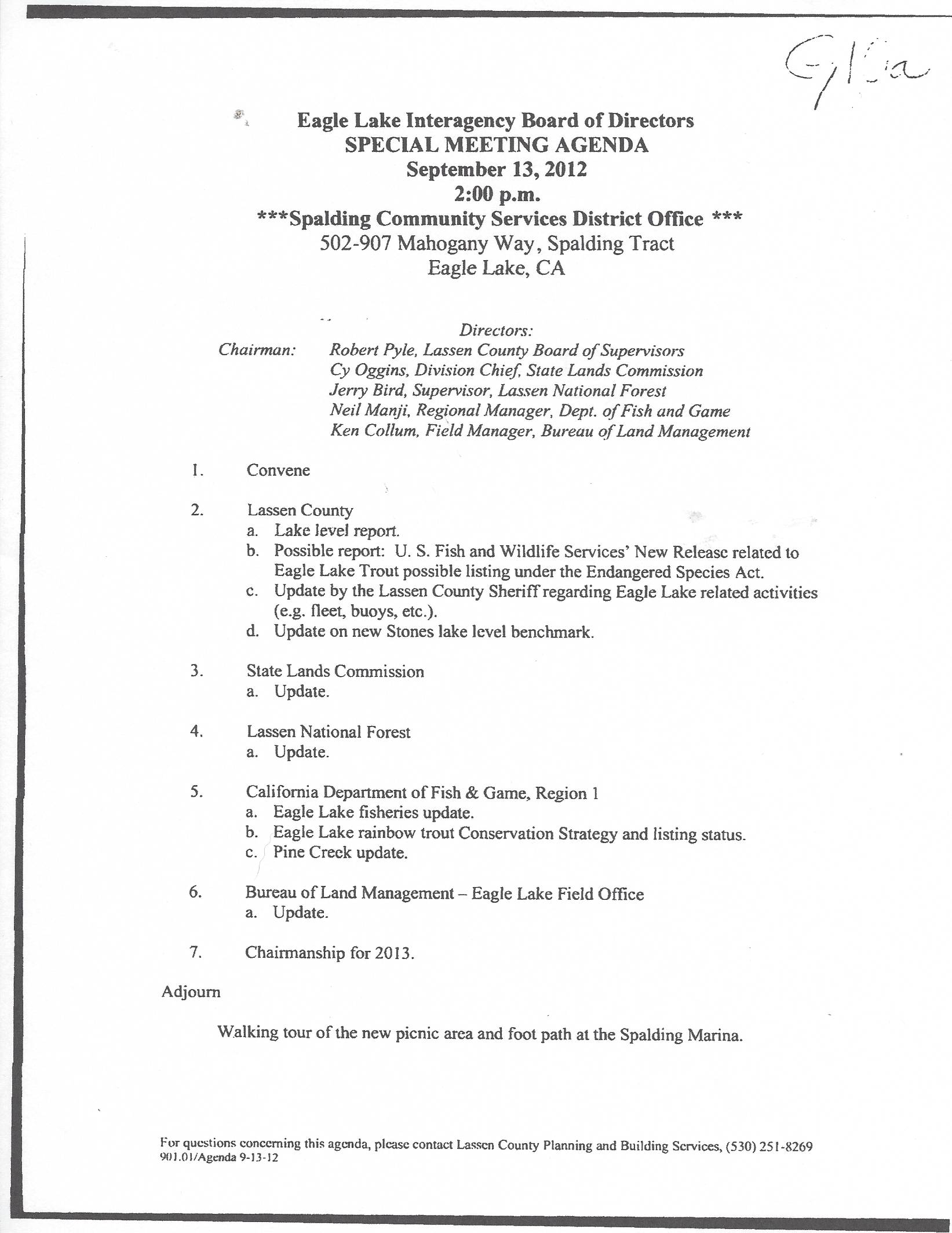 Supervisor Pyle is Chairman of the "Eagle Lake Interagency Board of Directors" and it could be assumed that this "New Eagle Lake Development" for a full service resort would have been on the September 12, 2012 Agenda.